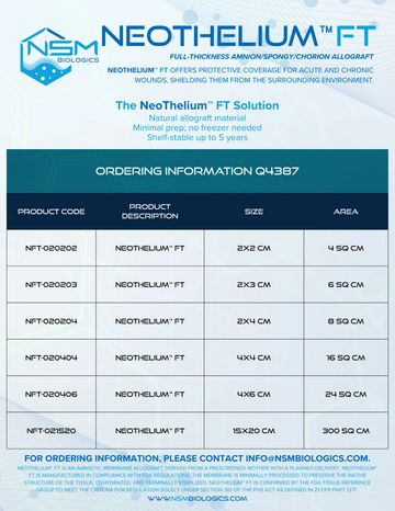 NeoThelium™ is an amniotic membrane allograft derived from a prescreened mother with a planned delivery. NeoThelium™ is manufactured in compliance with FDA regulations. The membrane is minimally processed to preserve the native structure of the tissue, dehydrated, and terminally sterilized. NeoThelium™ is confirmed by the FDA Tissue Reference Group to meet the criteria for regulation solely under Section 361 of the PHS Act as defined in 21 CFR Part 1271.