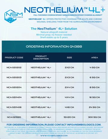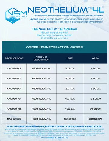 A full-thickness Chorion/Spongy/Amnion/Amnion/ Spongy/Chorion allograft designed for single-use as a wound covering. Its distinctive four-layer arrangement offers an alternative structural configuration within the NeoThelium™ portfolio, providing clinicians with another naturally derived option while retaining the integrity of the original tissue composition.